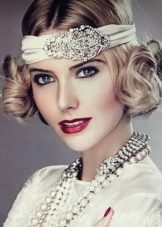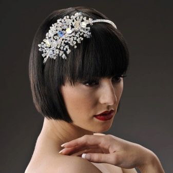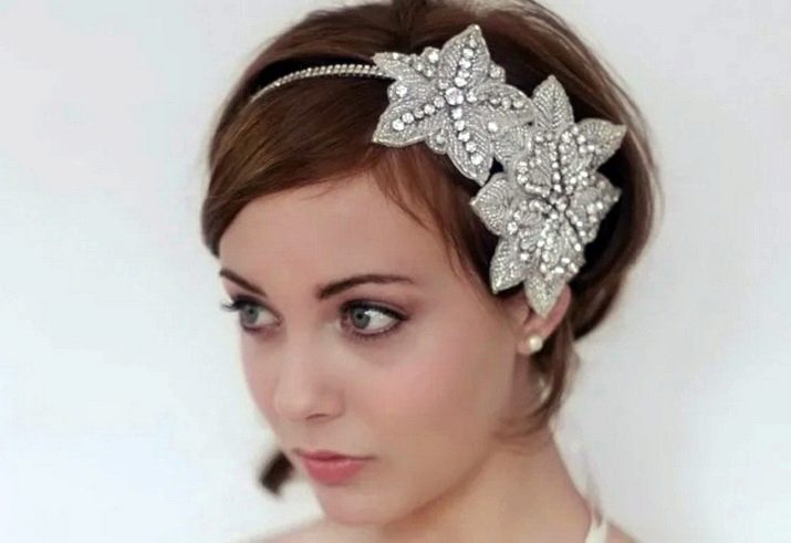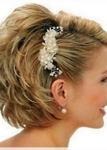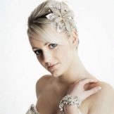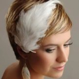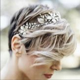 The main problem when creating hair styling on short hair, especially on ultrashort hair, is fastening of ornaments. It happens that to make it problematic. Therefore, stylists use different rims, bandages and ribbons. With their help, you can decorate the hair with a large flower or feather.