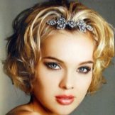 On short hair, you can create a hairstyle in the Greek style. To do this, the hair is wound onto a curling iron with a cone-shaped attachment, then the resulting curls are folded back and fixed either with hairpins, if the length allows, or varnish. In the presence of a long bangs it is laid wave on one side. From above the hairstyle is decorated with tiara, tiara or ribbon, creating the image of a goddess.