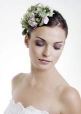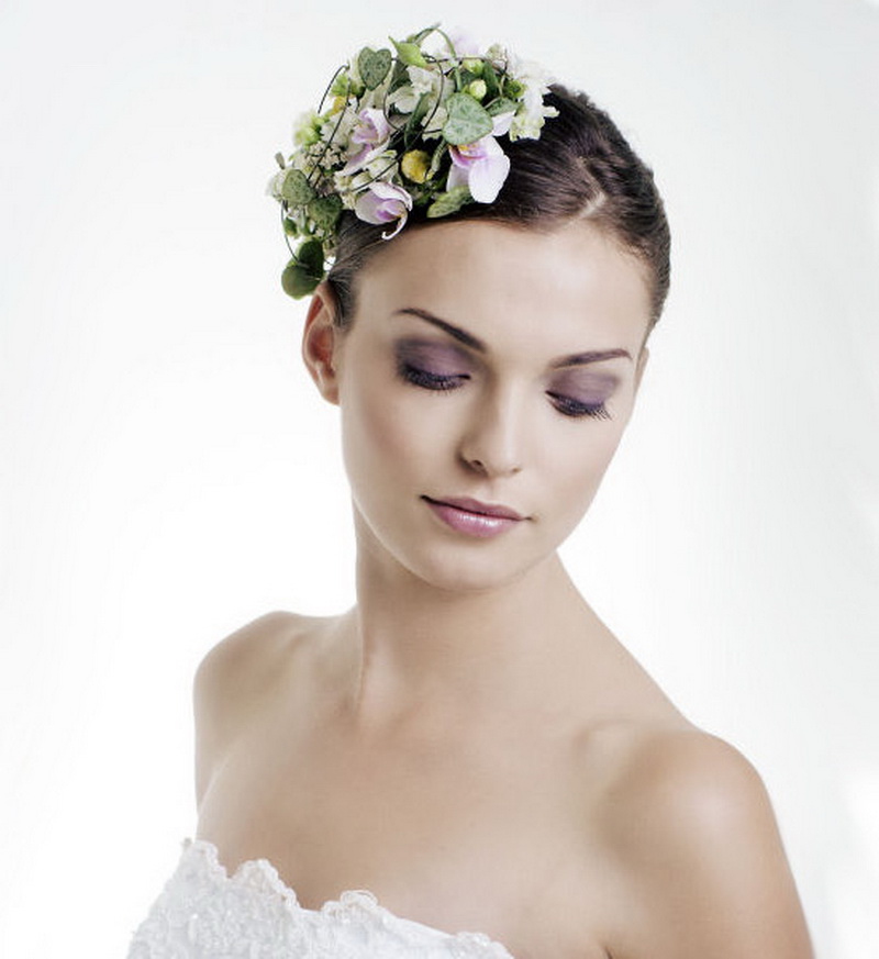 Flowers are able to bring in the image of elegance, naturalness and freshness. And they can be used one at a time, and you can in the form of a wreath. It looks original if the flower in the hair is combined with a bouquet of the bride and a boutonniere on the lapel of the groom's jacket. Interspersed with leaves and berries in the hairstyles of autumn brides or spruce and mistletoe in the winter.