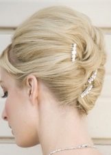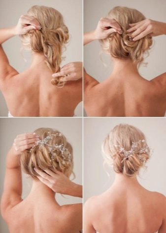Another styling option relates to naturally wavy stripes. In this case, they can be combed back, raising to the top of the head and creating a volume. If the length is enough, you can simulate the "shell". Long bangs laid on the side, short pull forward on the forehead. The tiara is fixed closer to the magnificent top.