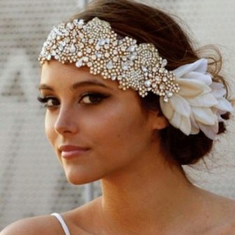 Headbands vary in width from narrow leather bands to wide soft laces. They are very popular in the ethnic style or the direction of retro. Various decorative elements can be attached to them: feathers, flowers, rhinestones, pearls, monists.