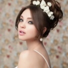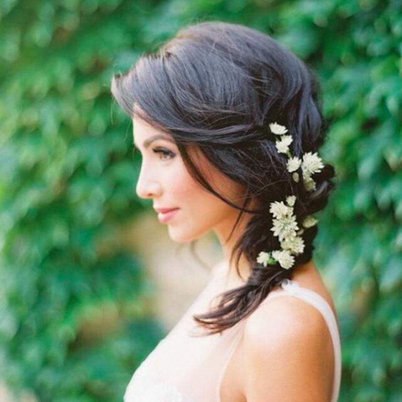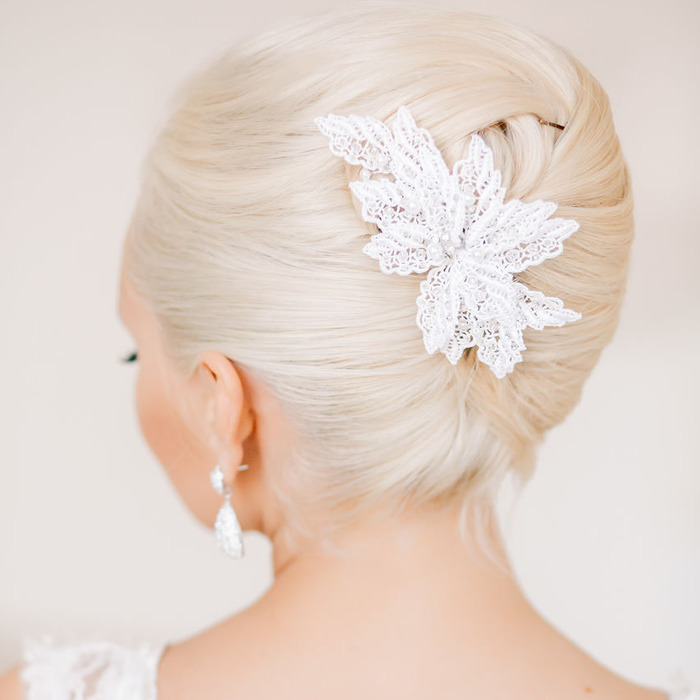 The hair is decorated with a decorative flower on one side or a rim with a floral design.