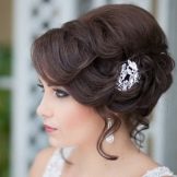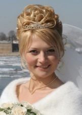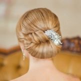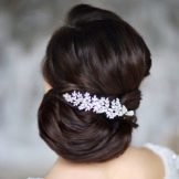 - Bundle - a classic hairstyle, used at all times. It seems to be too simple for a wedding celebration, but this is a delusion. With it, the image becomes elegant, feminine and tender. If the bride has hair of fine structure, then this hairstyle will increase the volume due to the overhead elements: hairpieces and postizhy. The bundle can be smooth or fluffy, high (at the crown) and low (at the back of the head). It is amenable to experimentation, giving the opportunity to fantasize when creating original designs. The highlight for any age will be playful curls framing the face. For young brides, such a move would give romance, more mature - youth and freshness. The bundle is very practical when worn, as the hair is collected and securely fastened.Decorate hair with beautiful hairpins, flowers, combs with rhinestones or beads, some models suggest tiaras or tiaras. Luxurious shiny hair does not require frills in the form of jewelry - they are beautiful in themselves.