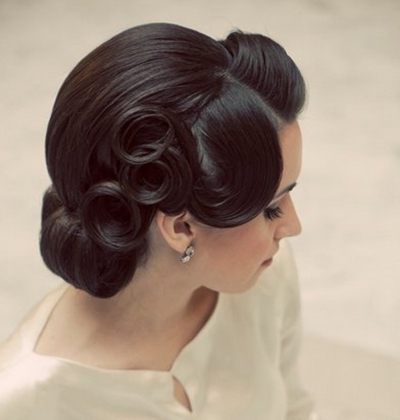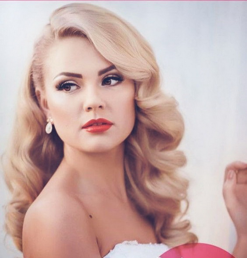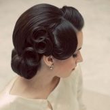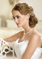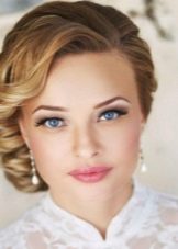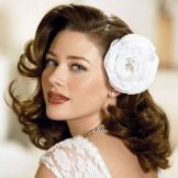 - Retro. Oddly enough, but this style is always in fashion. At the same time it is elegantly simple, which is expressed not only in the hair, but also in the dress. Girls who gave him preference, choose mini-dresses and bright makeup. Among the jewelry wins pearls. Large waves are fixed with varnish. They can be playfully laid or taken in a smooth beam at the back of the head with a wave laid from the front strand. A large flower made of cloth is sometimes fastened in the hair. Short veils, various hats or tablets are also popular.