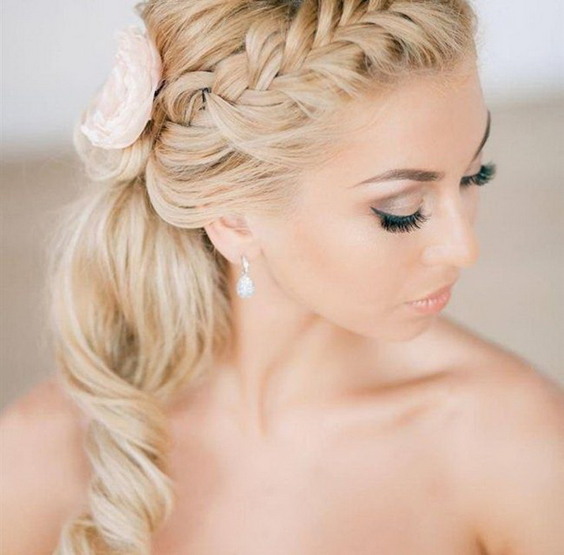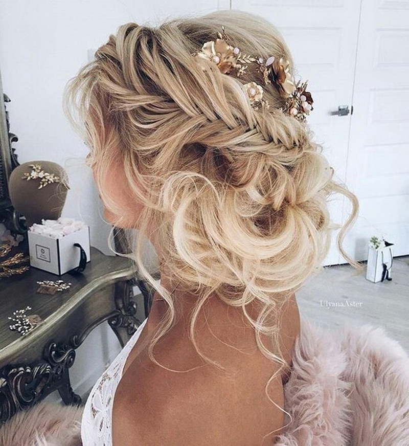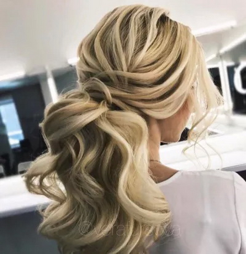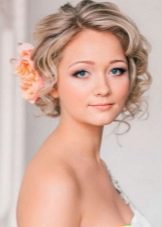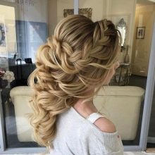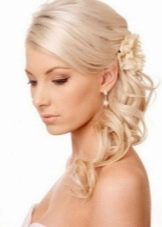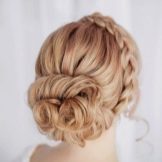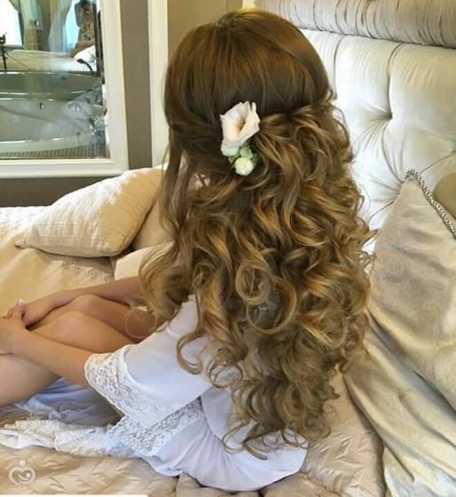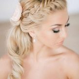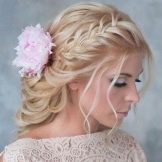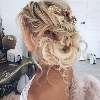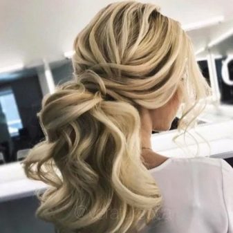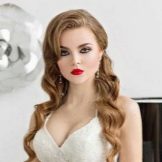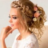 Certainly suitable for laying any weaving. Various smooth bunches, decorated with ribbons and flowers, bows of hair are excellent win-win options. Curls also look spectacular, but they are hard to keep for the whole day, as they straighten out under their own weight.