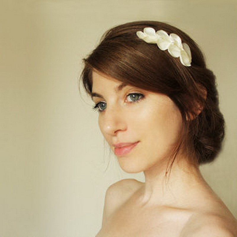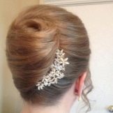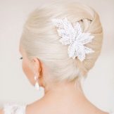 - Wedding "shell" simple, but it is this that emphasizes elegance. In order not to burden the image, you should carefully approach the choice of hair ornaments. Small flowers along the shell, studs with rhinestones, a string of pearls or a hairpin of medium size on one side are appropriate. Looks very nice front strand, laid (like oblique bangs) on one side.