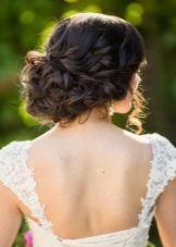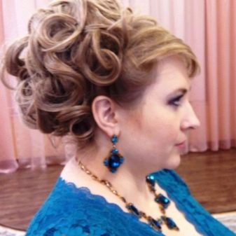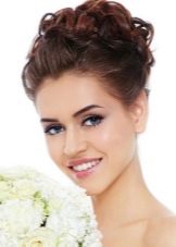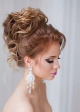 - Owners of curly hair can be advised high beam at the crown. To do this, the hair is collected in the tail, a roller is put on it, the hair is twisted under it in a spiral and fastened with pins. If you release a few strands, the hair will play and will look natural.