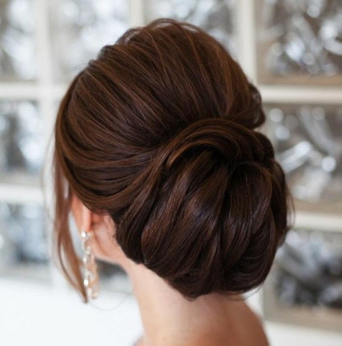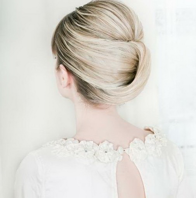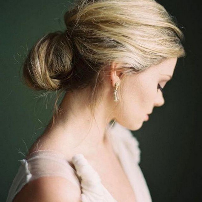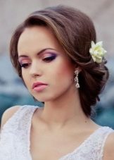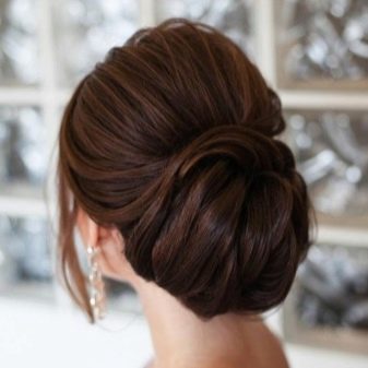 - Minimalism. Femininity and elegant simplicity will never go out of fashion, so the most usual sleek bun can transform a bride. If she has a long swan neck, a dress with an open top, then the look will be very impressive. The knot can be positioned high on the crown or on the back of the head, decorated with beautiful hairpins or flowers. In this case, suitable veil of any length. Since this hairstyle as much as possible to tear the face, it is necessary to pay maximum attention. Stylists propose to focus on the eyes and include big earrings in the image. The great advantage of this hairstyle is its stability - you can dance and move as much as you like.