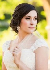 - A long veil is chosen by the bride for the wedding. It also helps to hide some defects in appearance. The styling for such a veil focuses on the facial design, since the rear view will be closed. High models are popular: babette and bunches, complemented by weaving and playful curls. Light waves from bangs or front strands also look interesting.