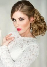 - The low beam at the back of the head is also particularly popular. From the hair behind the bunch is formed, decorated with ribbons, flowers, rhinestones, according to the image. The face remains "slightly lost" curls. The bundle may be smooth or bulky.