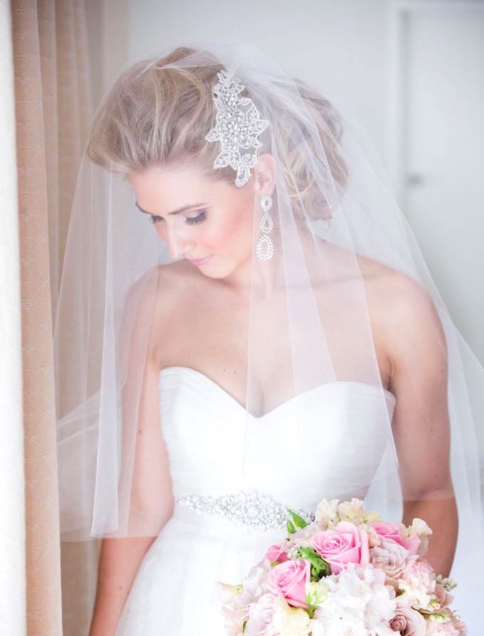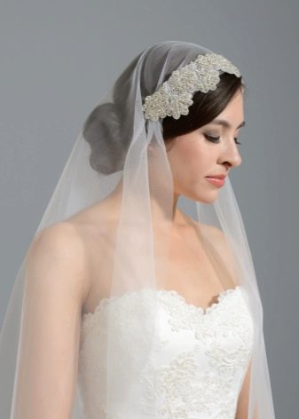 - Single tier veil looks advantageous in a sleek style. Simple, elegant hairstyles are suitable for her - loose hair is not recommended. The most relevant option are hairstyles with tight braids. The piece itself is attached in the center and decorated with ribbons or lace.