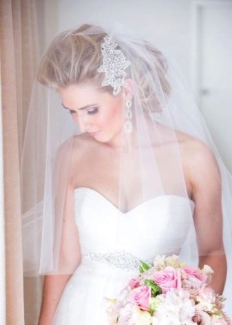 - The shortened version of the veil of light and airy fabric does not burden the gentle image of the bride. For its fastening use various accessories. Stylists are advised to use high styling or retro style. Look good with a short veil all sorts of braids.