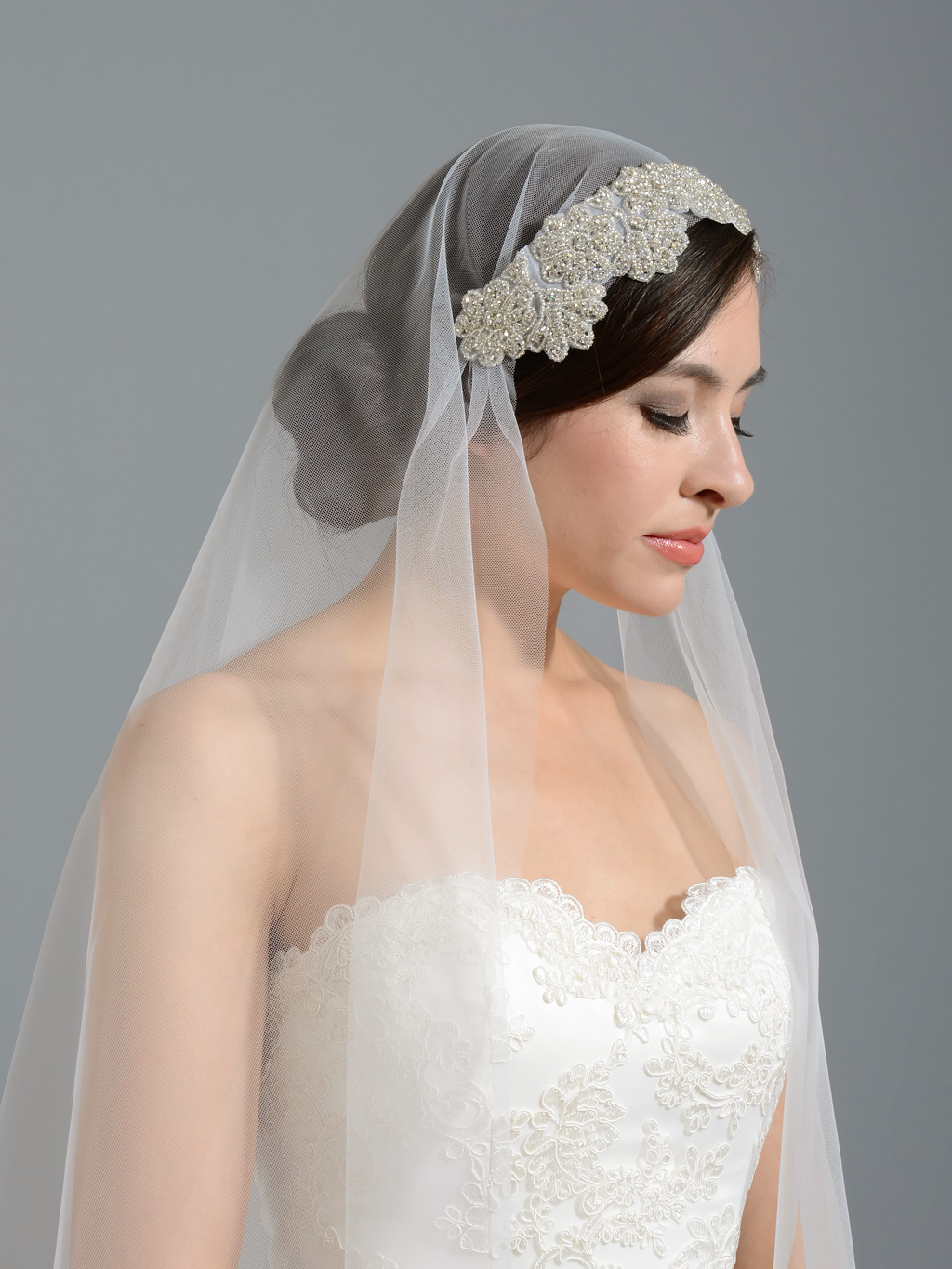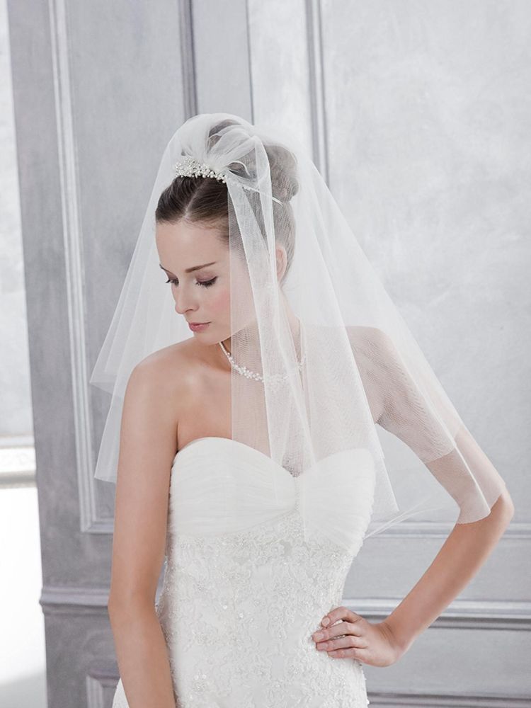 - Multi-tiered veil looks very impressive, but it is difficult to choose a hairstyle for her. This model suggests a gorgeous image, so simple styling is inappropriate here. Stylists offer to stay on high designs, decorated with intricate weaving and various decorative accessories, for example, with a crown diadem.