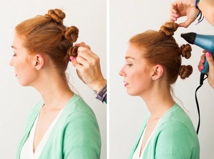 Next, tilt your head down a little and start to blow dry your hair with a diffuser. You should pay special attention to the basal areas on the crown, as well as the front area. Further, moving the diffuser along the entire length, you will create slight negligence. This method is most convenient for not very thick hair length to the shoulders or short strands.