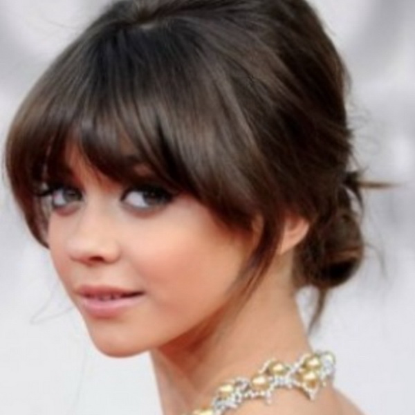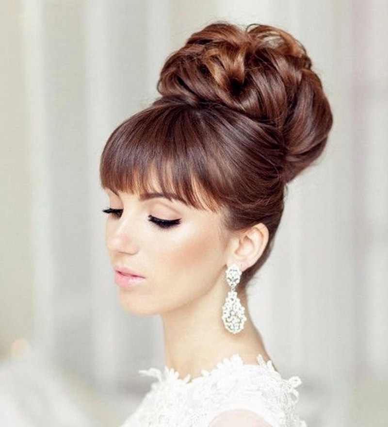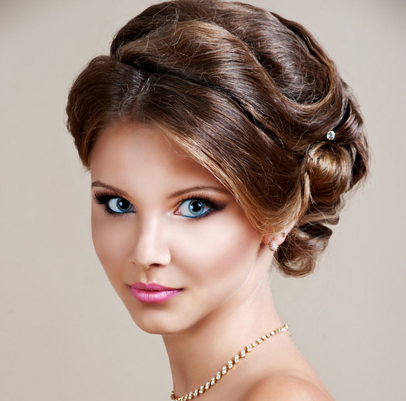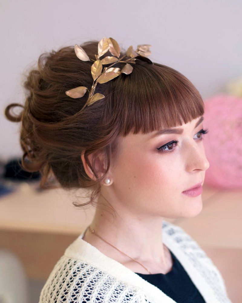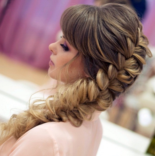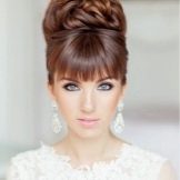 Oblique bangs always successfully complements high hairstyles with a pile. Strands are collected at the top in a knot, bundle, or other arrangement and are decorated with fresh flowers, a ribbon, or a rim. It is also appropriate when all the hair is combed back and left flowing “to drain” along the back, or it is laid on one side. It is worth mentioning that oblique bangs, in contrast to the straight, perfectly blend with a variety of braids and weaves, even the most complex. For example, a good idea would be to braid the openwork braid on one side.