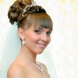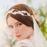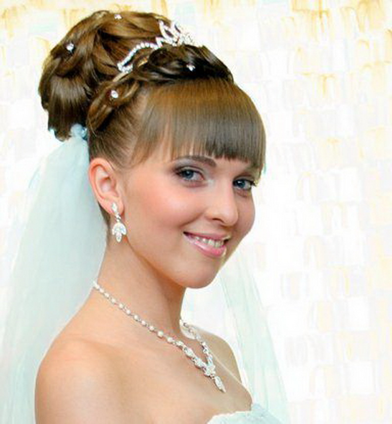 Stylists recommend combining the bangs with a diadem or a veil. If the bride wants to appear in front of guests with a crown, then she should place her in the place where the bangs begin. The decoration can be completely different. Delicate accessories resembling a silver or gold bezel will suit fragile and romantic girls, and bright tall ladies should take a closer look at the luxurious, almost real crowns decorated with a scattering of stones or rhinestones. In addition, there is no need to be limited only to loose hair - the tiara is suitable for both braids, and high styling, and elastic curls - you should not forget about the bouffant. Finally, it should be mentioned that the crown is suitable for any type of bangs: straight, oblique, short and long.