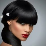 The outfit on this day should be simple and unfriendly. It is recommended to choose dresses of classic models, not burdened with bows, lace and ruffles.The bang itself will have to be perfectly smoothed with the help of special means, as well as to cut it so that it does not seem too thick and weighting the face. Perfect straight bangs cover the forehead, but not too much.