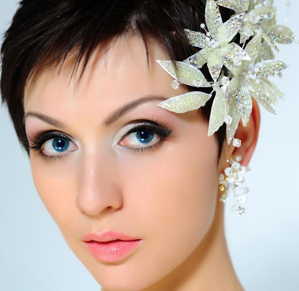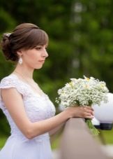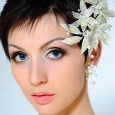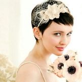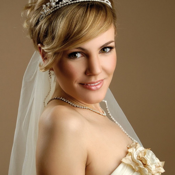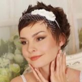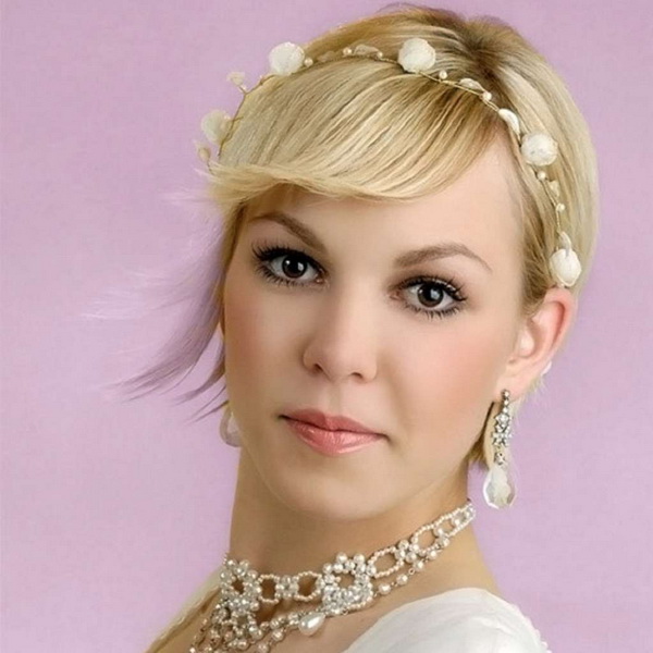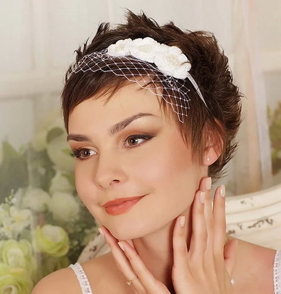 If the bride has a short haircut, as well as a fringe, then the last one will have to either be made straight or combed on one side. If the wedding should be themed, then the hair can be combed up and make a kind of tuft. In any case, short hair is given sufficient volume, if desired, they are decorated with accessories. In the case when the short bangs are accompanied by hair up to the shoulders, the mass of hair can be curled into curls, put in a rim of a pigtail or twisted into a bun. For such hairstyles fit headbands, tiaras, veils or decorated headbands.