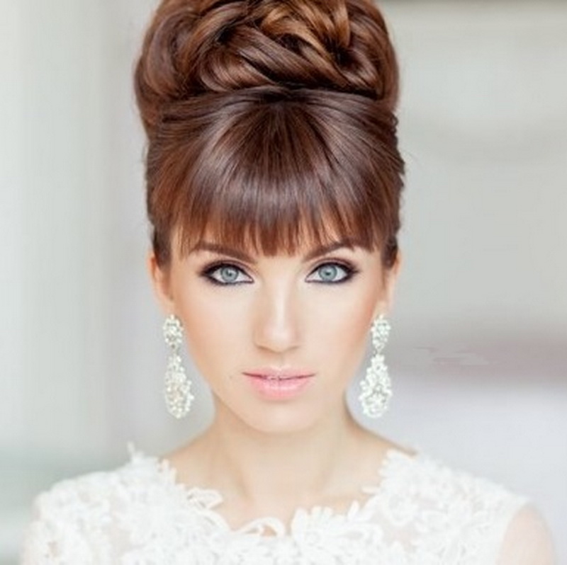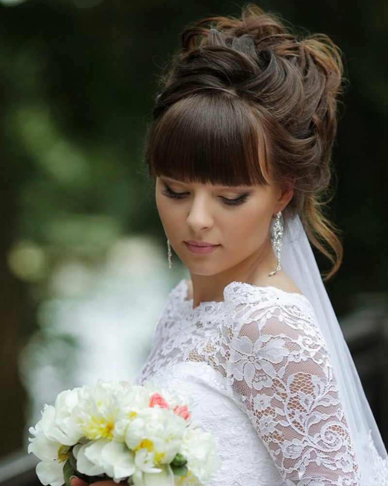 It is important to begin with the fact that the hairstyle with bangs should be organically combined with the shape of the face, and with the image of the bride, with the available accessories, and with the general theme of the wedding. You should not cut the bangs just before the wedding. There is a high probability of excessive hair shortening, which simply do not have time to grow to the norm. If, however, a correction is made two or three weeks before the event, there will be enough time to bring everything back to normal. In addition, the preparatory procedures are necessary for those brides who always wore bangs straight, and wanted a slanting wedding. A couple of days before the event they will have to comb their hair in the right direction.
