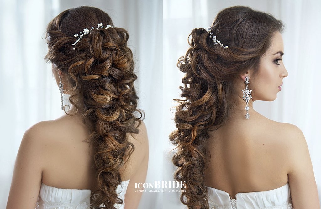 The hair in this style is beautiful in and of itself, and with the addition of small accessories. With such a hairstyle, the tiara is the most popular, but the volume veil will not be the best companion. It is also worth thinking about choosing a dress. Loose hair, falling on the back and shoulders, require the most open top of the dress.