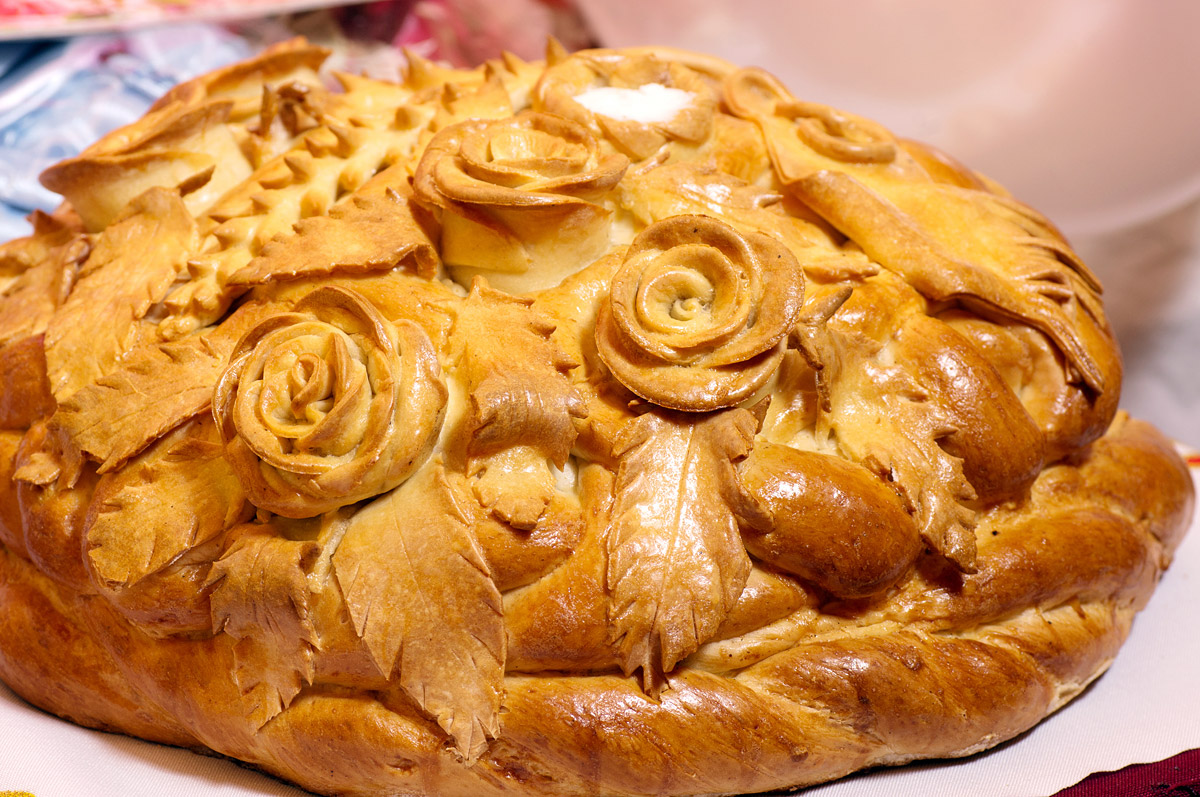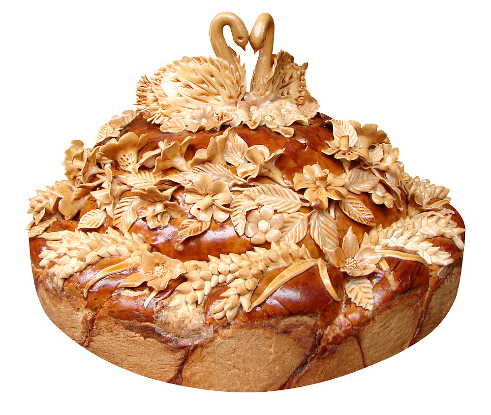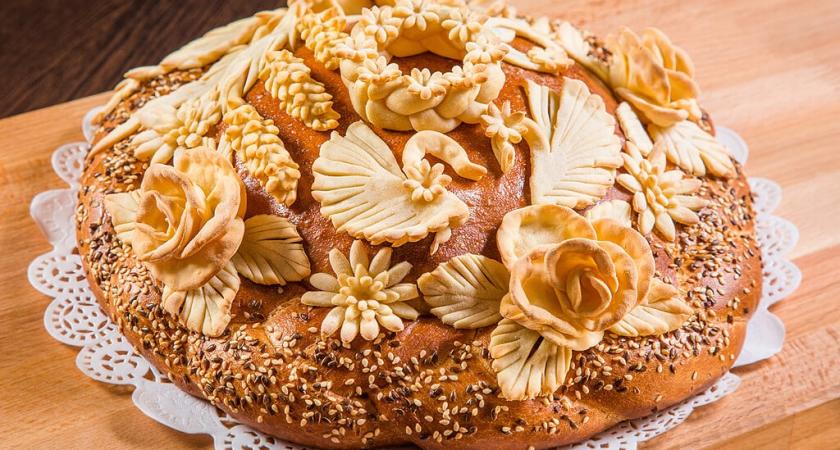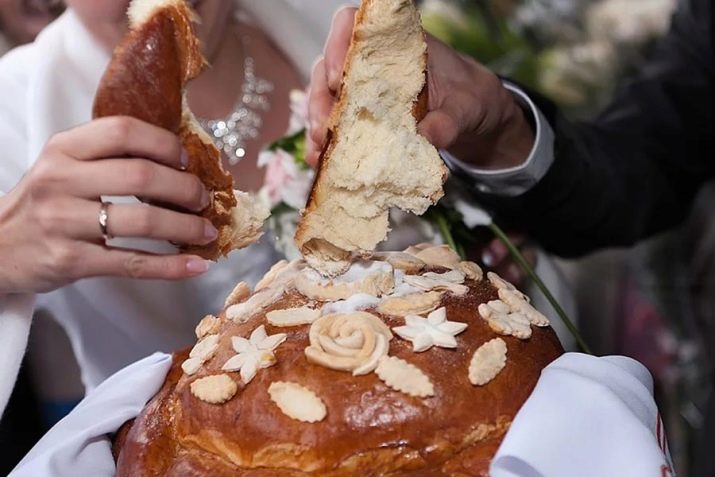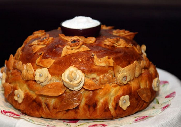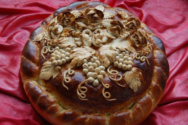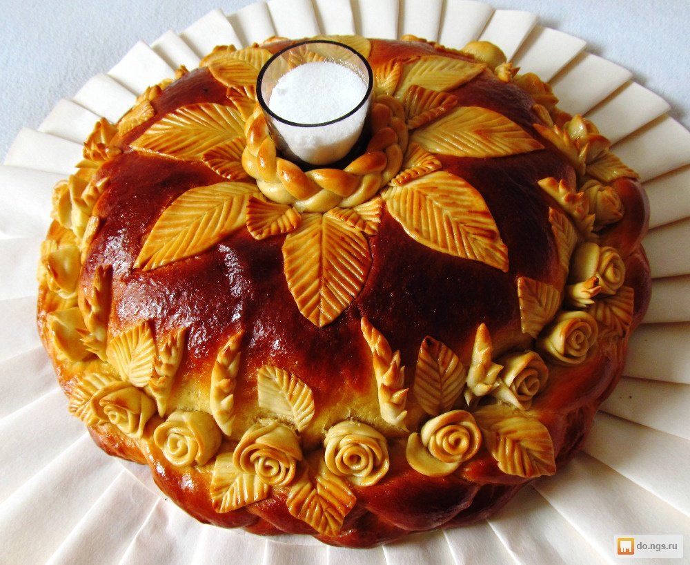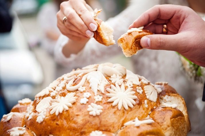 When cooking cake, in the center make a groove for salt. It is decorated with different elements. By tradition, the newlyweds should together pinch off the edge of the loaf, dip them in salt and eat them. This will mean that they ate a pound of salt together and in the future they will have a happy life together.