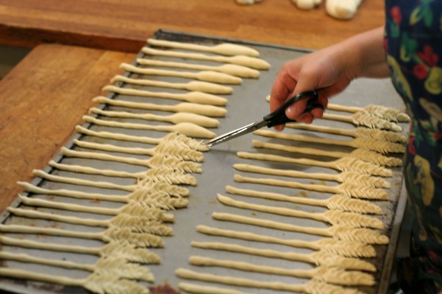 - To make an ear, we roll a small dough roller out of one centimeter diameter. Flatten one end to make a cone. With small scissors we make cuts all over the surface of the roller to make spines. Then a little pulling our roller, holding his ends. The spikelet of wheat turned out.