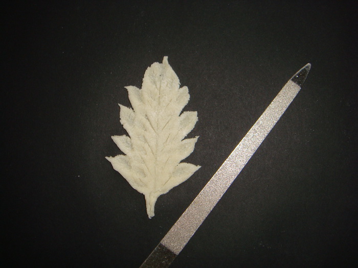 - To prepare the leaves, we make diamonds of different sizes from dough. On the edges of the rhombus, cut out small pieces of dough with a knife. There should be jagged edges. Decoration is ready.