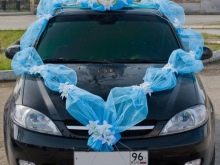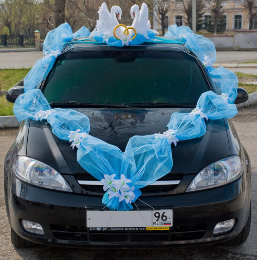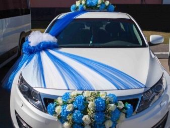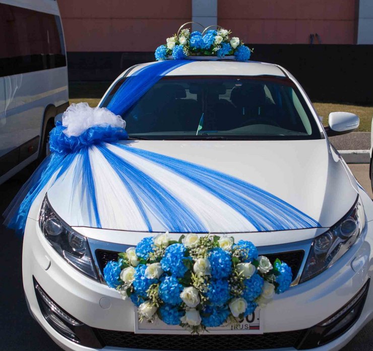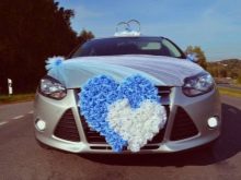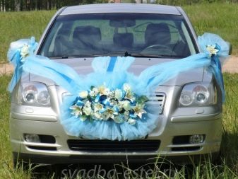 Otherwise, you can decorate the car with blue decorative elements. For example, on the body will look beautiful balloons of heavenly shades, flowers, ribbons. You can see one of the design options.