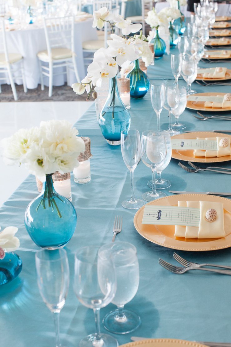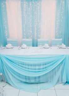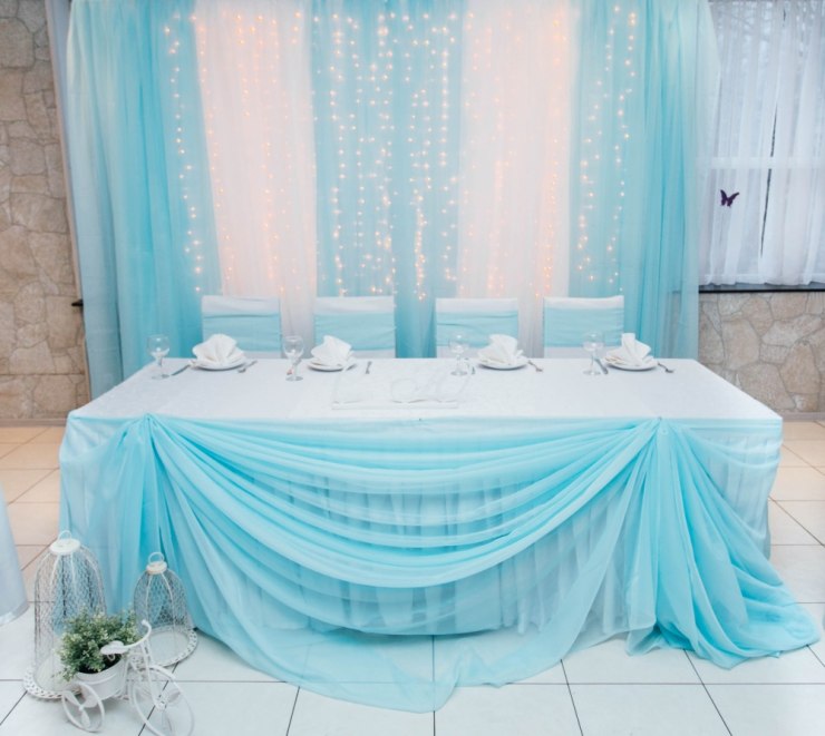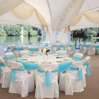 The main rule in the design of a banquet hall is not to overdo it with blue color, otherwise the room will be filled with a cold uncomfortable atmosphere.When decorating you need to know the measure. It is usually recommended to arrange the wedding in blue and white colors. For example, it is better to make the tablecloth on the table and the covers on the chairs white, but stretch the sky path along the tablecloth, and tie the same ribbons on the covers. Napkins are best used with lace.