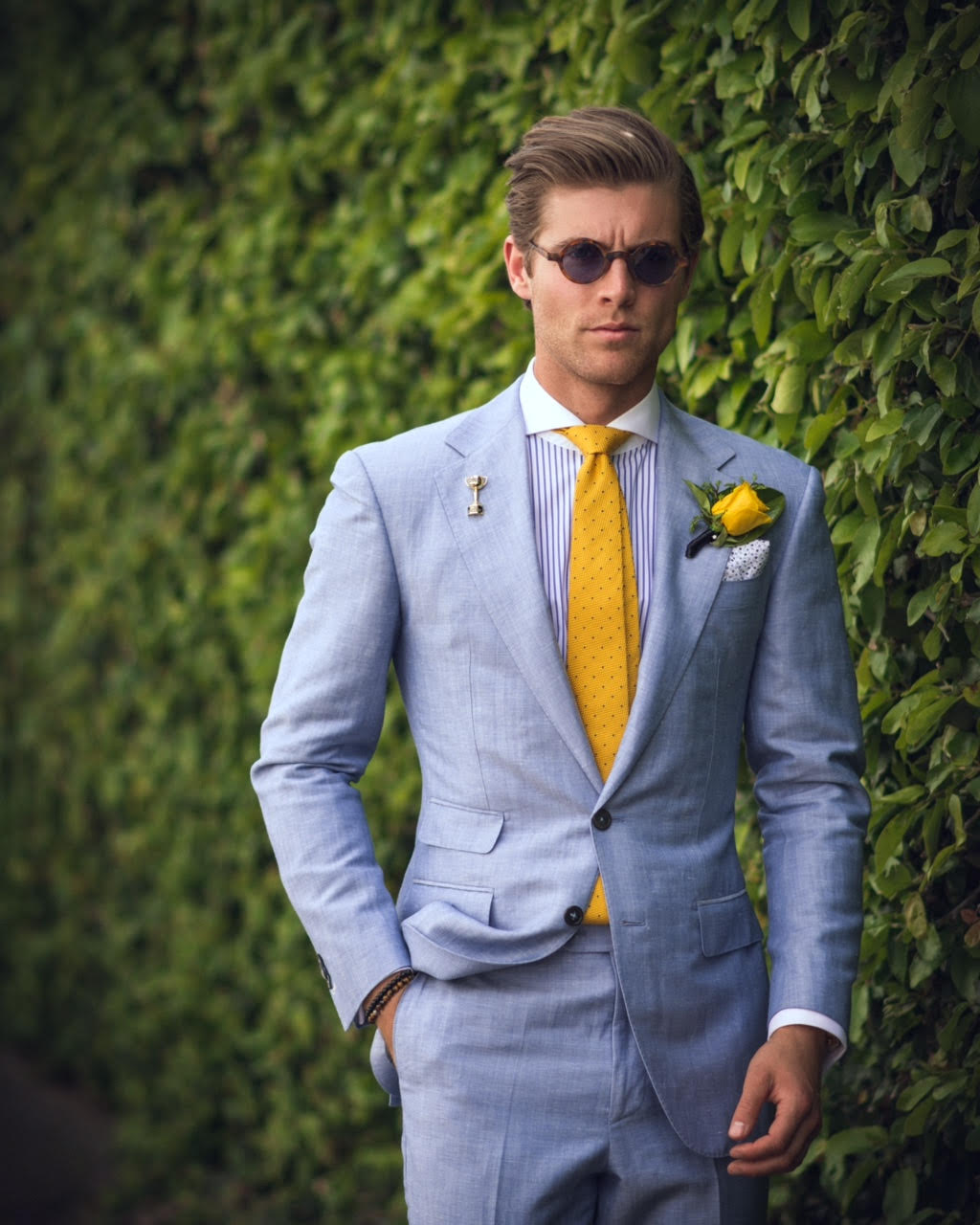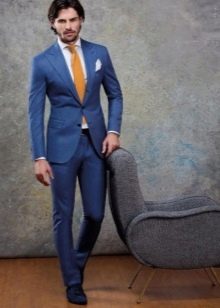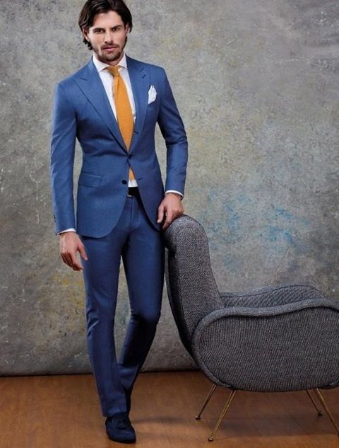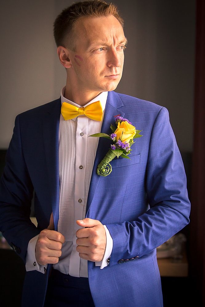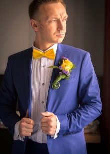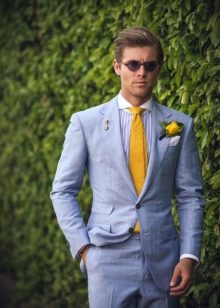 Holiday dresses newlyweds can be made in blue tones. You can emphasize this outfit with a golden accessory. For example, the groom will look very expressive in a blue suit and a gold tie. Another option for the groom is to replace the jacket with a blue waistcoat with a golden bow tie. This is a more summer option.