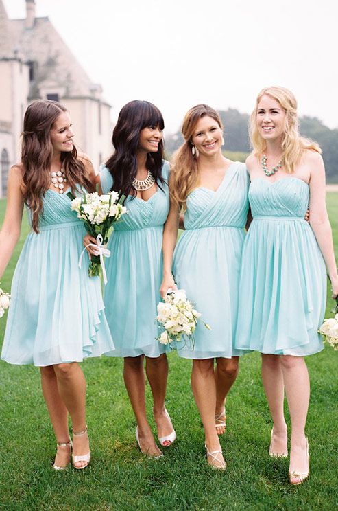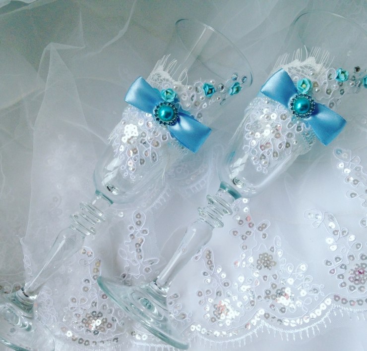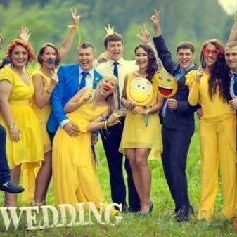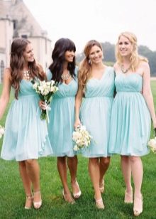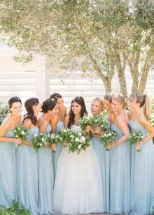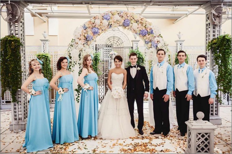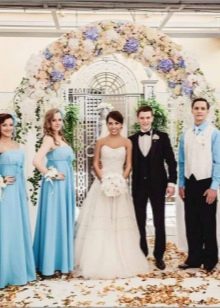 Guests should also wear blue attire. Bridesmaids in blue dresses and friends of the groom, with butterflies of the same color attached to the collar, look fun, easy, youthful. Special attention should be given to the image of the witnesses, their costumes should be in harmony with each other. For example, a light knee-length dress in a delicate blue color will suit a girl. Then the witness should pick up a shirt to match, you can in the cage.