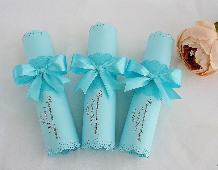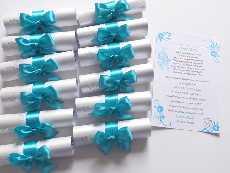 This element should also be given no small importance. You can order such invitation cards that all guests will keep for memory. These can be addressed items in the form of standard cards, or you can think of something unusual, for example, handing invitations in the form of a scroll tied with a beautiful blue ribbon. Handicrafts are more valued, so it's best to contact the master of the hand-made and order personalized postcards.