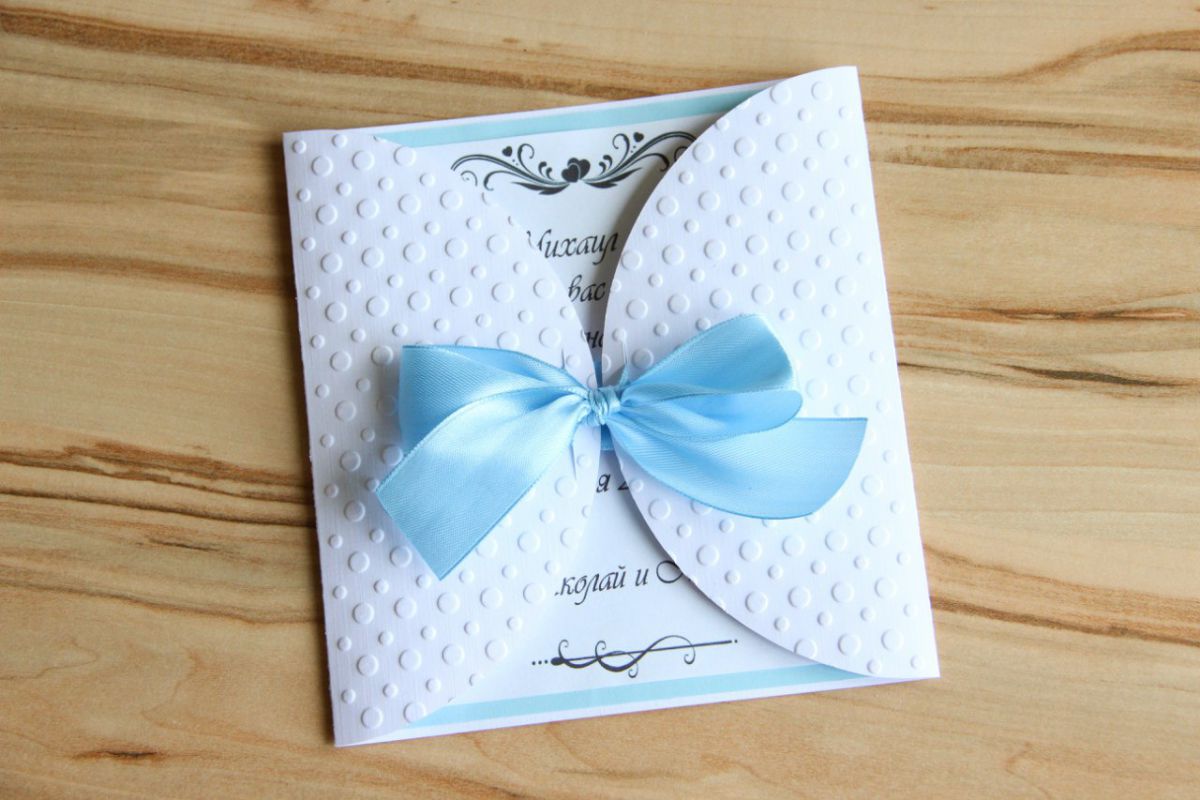 However, in this case, you should not choose a rich blue or blue color. The fact is that the vision easily perceives only a dark font written on a light background. If the card will be juicy blue, the invitation text will have to be written in white font, which is very difficult for visual organs to perceive.
