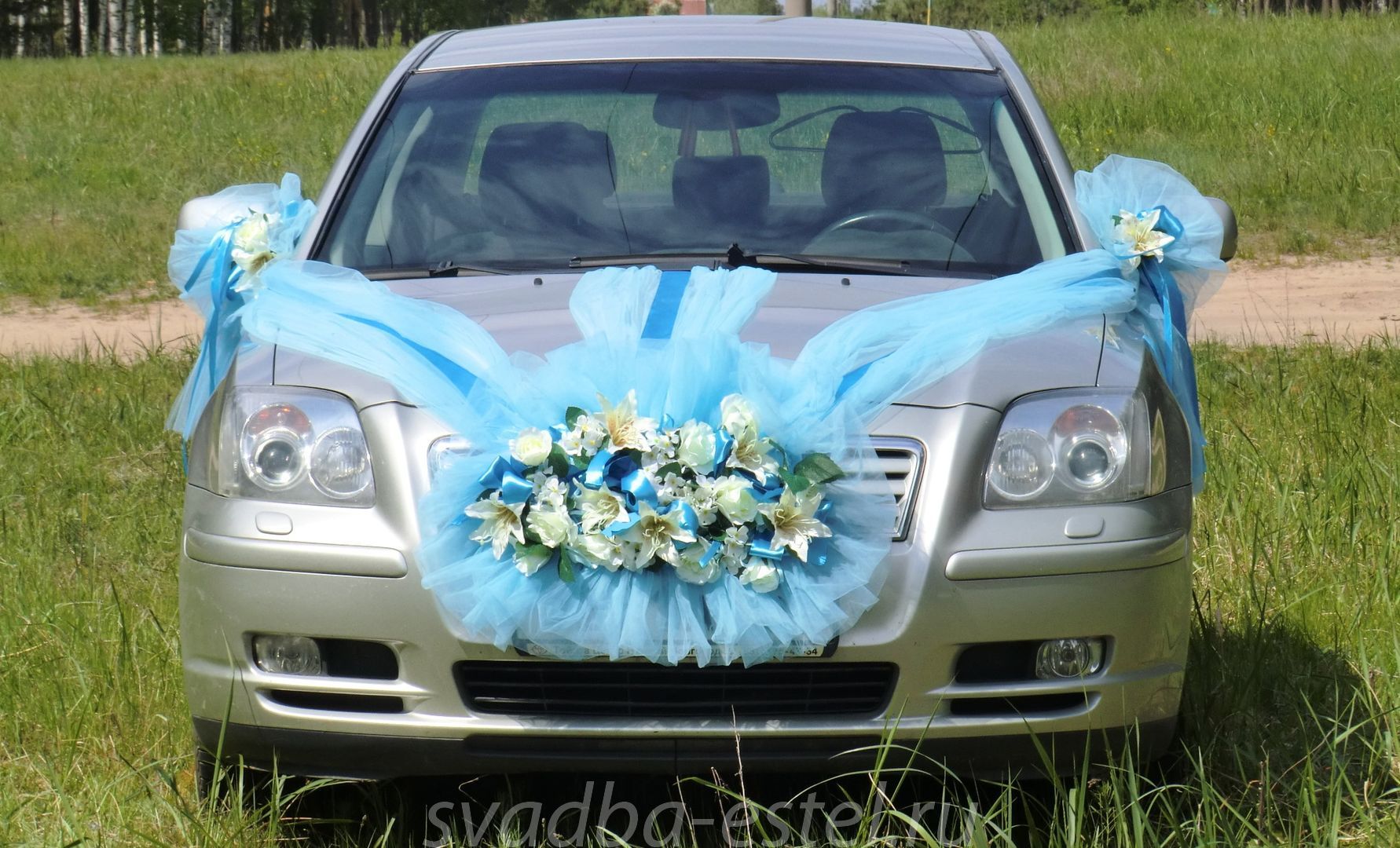 - Using flowers, spread on the hood of small lines. Also come with blue ribbons.