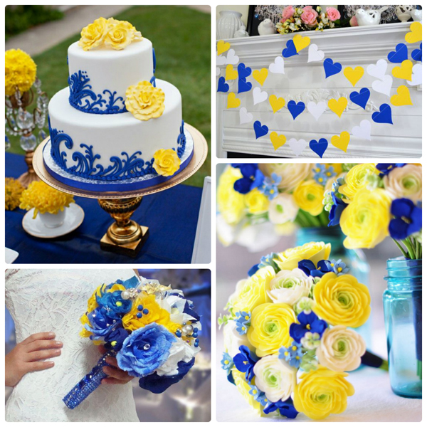 - Yellow or gold. The combination of yellow and bright blue or blue looks especially impressive. A great option for an autumn wedding.Celebration very well fit into the landscape with falling leaves against the backdrop of cloudless skies.