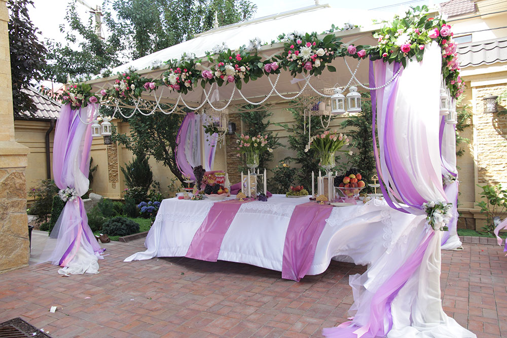 Banquet hall must be equipped with antique furniture, linen tablecloths, field bouquets, vintage elements.If the event is held outdoors, you can create an arch of fresh flowers. In the room under the flower arch is allowed to decorate the window openings.