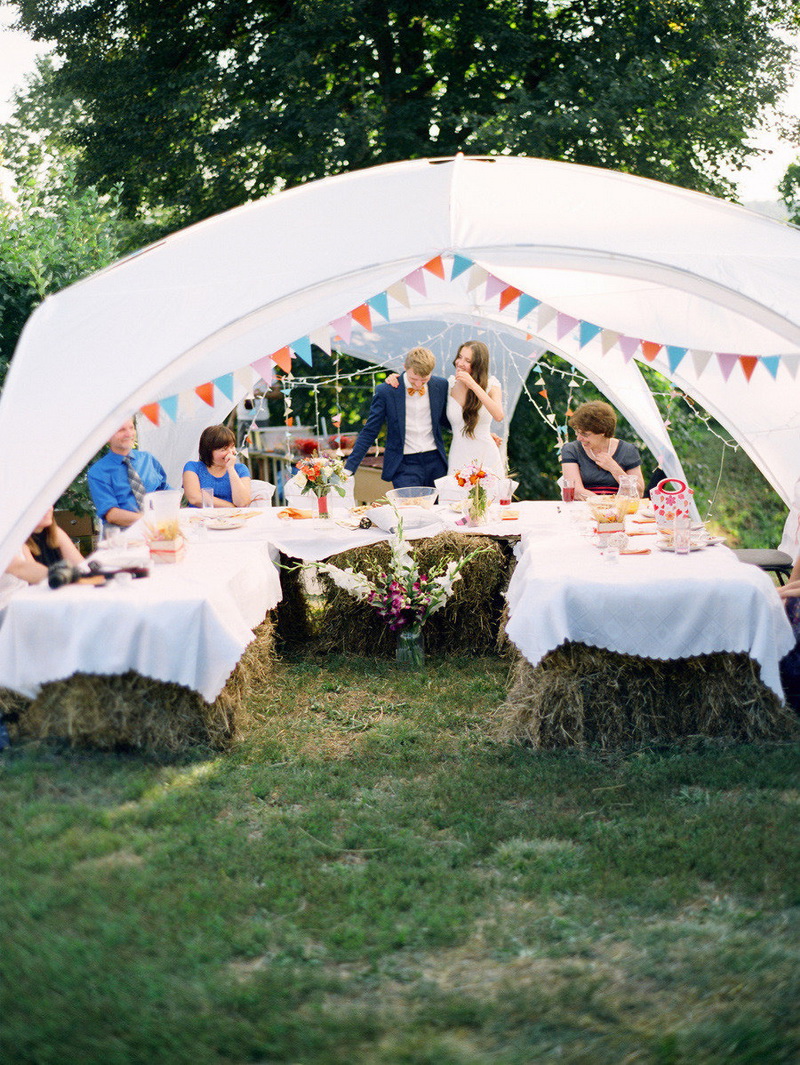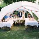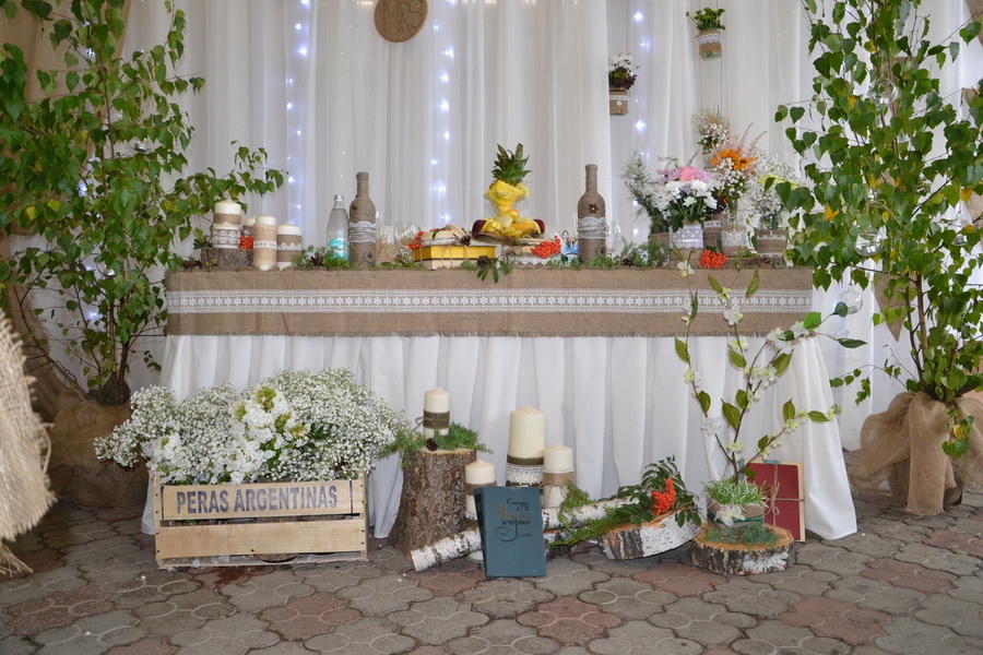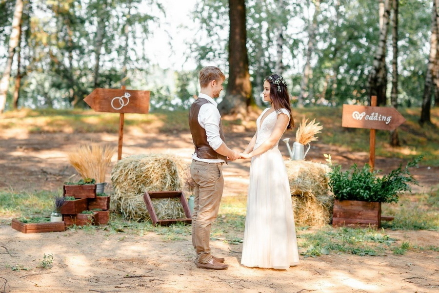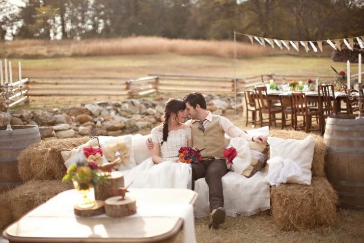 In order for the holiday to be remembered by all who came, it is necessary to create the necessary atmosphere, to organize a photo zone. You will need natural materials. It can be carts and wheels, hay bales, watering cans and buckets, bottles and barrels, candles, bicycles, hammocks. All these attributes will be able to emphasize the style, capture bright frames, deliver positive emotions not only to the bride and groom, but to all the guests. Usually the photo zone is made in nature. If the weather does not allow, then you can choose a secluded place.