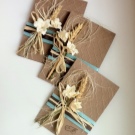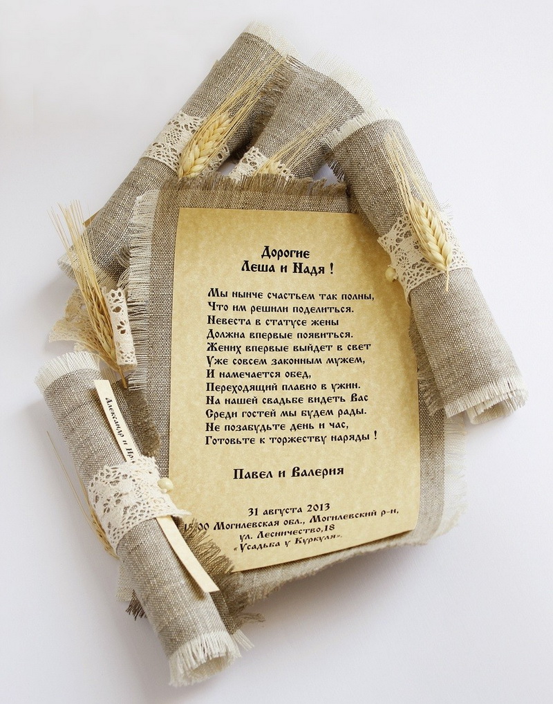 - Invitations. They can be stylishly made in the form of scrolls tied with a straw. Let the text be written with a pen, like on the landing cards.