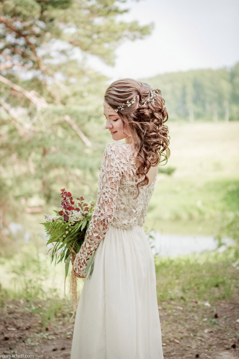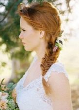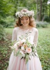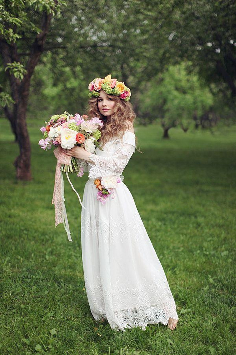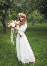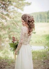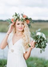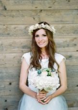 Clothes and hairstyle are simply obliged to overlap. You can beautifully woven into the braids of the lily.Forget about bulky hairstyles, a simple braid will look most interesting here. Wooden beads, earrings, bracelets, as well as handmade work are very relevant. Carefully choose a bouquet - it should consist of any wildflowers. Stylish will look like daisies, dandelions. You can combine plants in a single composition, it should be simple, but attractive.