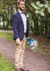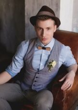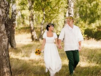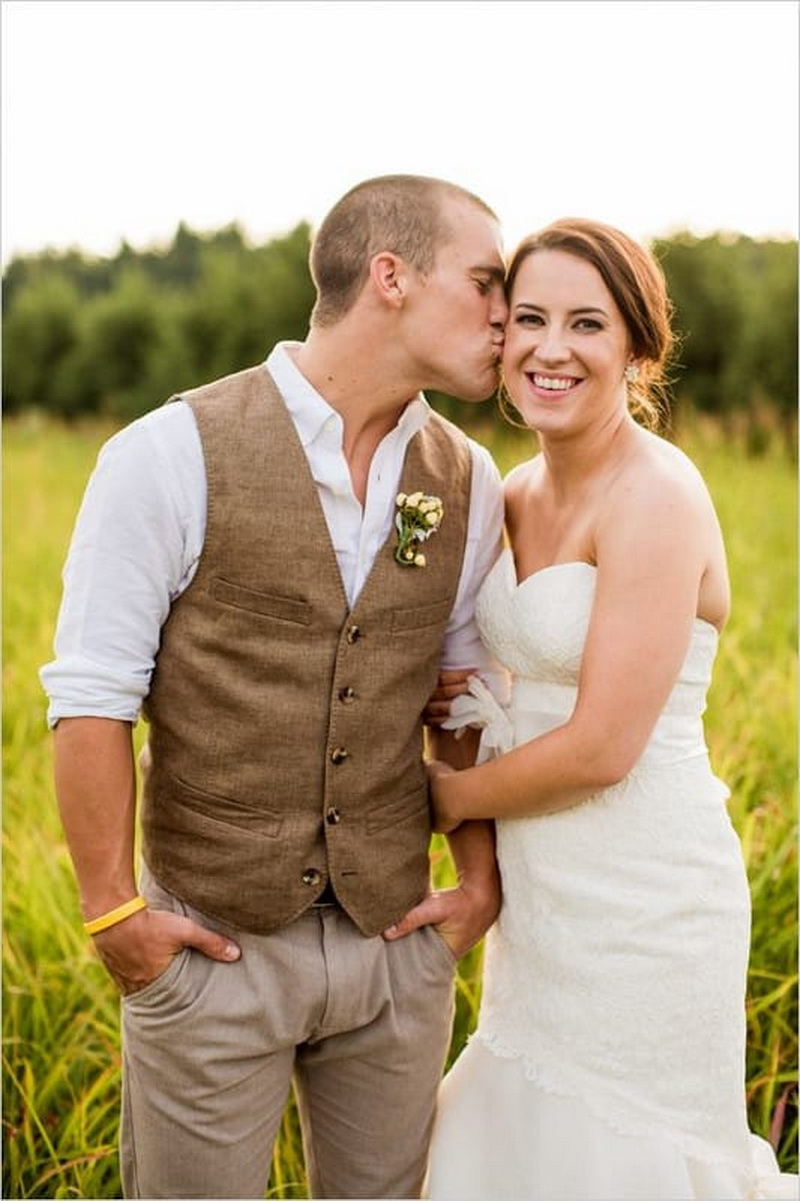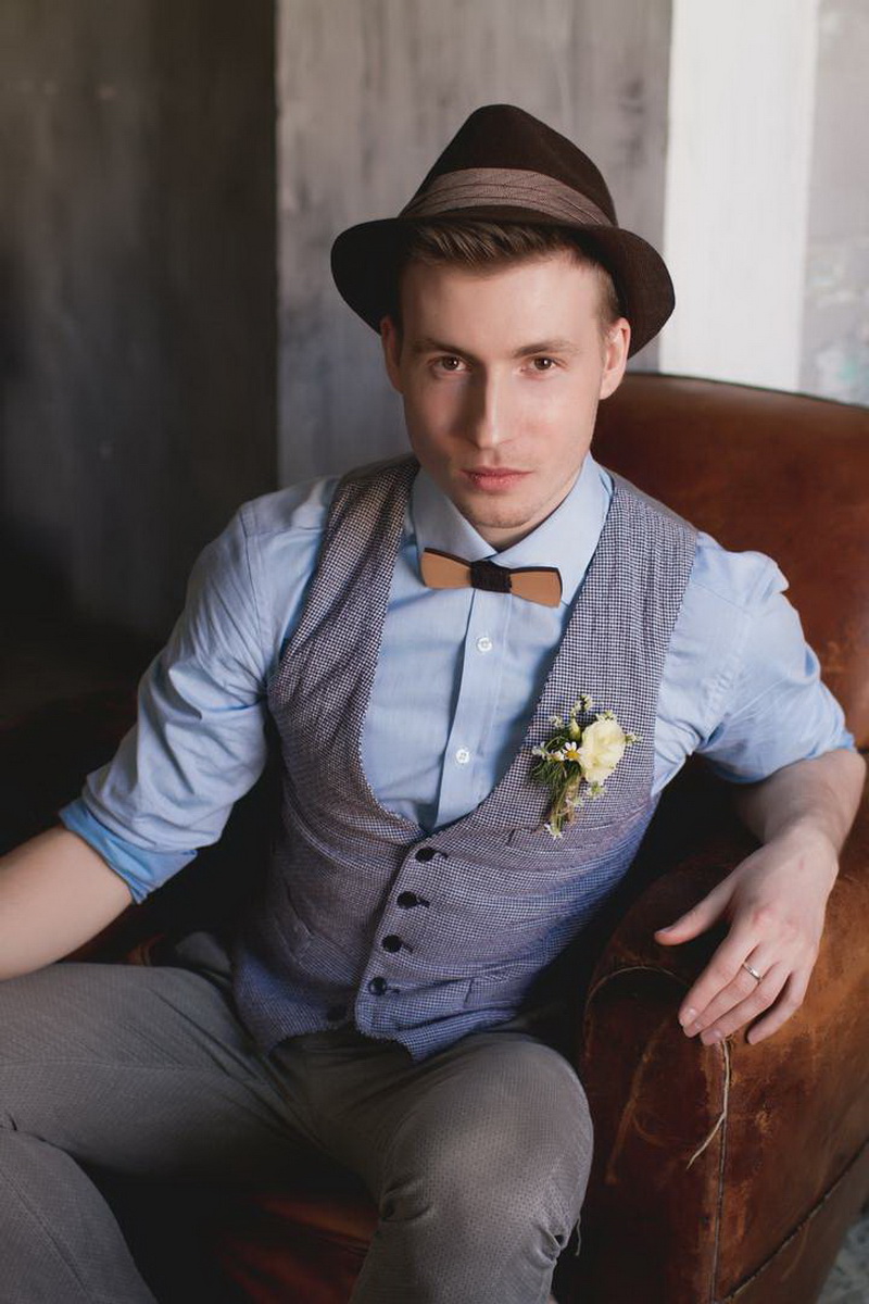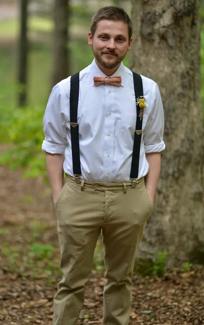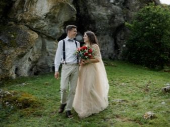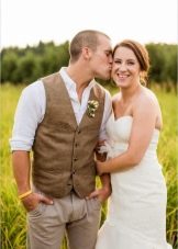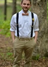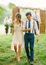 The groom on this day should also be on top. Rustic image suggests any subdued-delicate tones, except for black. You can choose brown linen trousers or cotton options in dark gray. The shirt should be white, with short or long sleeves. The original version will be suspenders in tone to the pants. They ideally emphasize the stylistic direction.