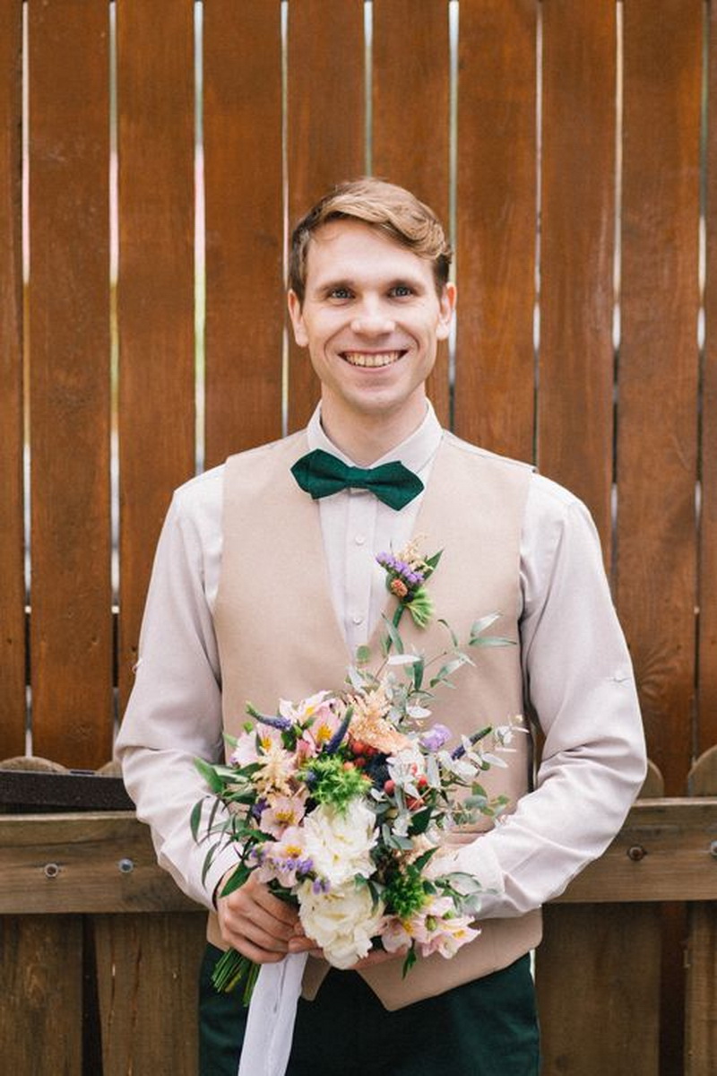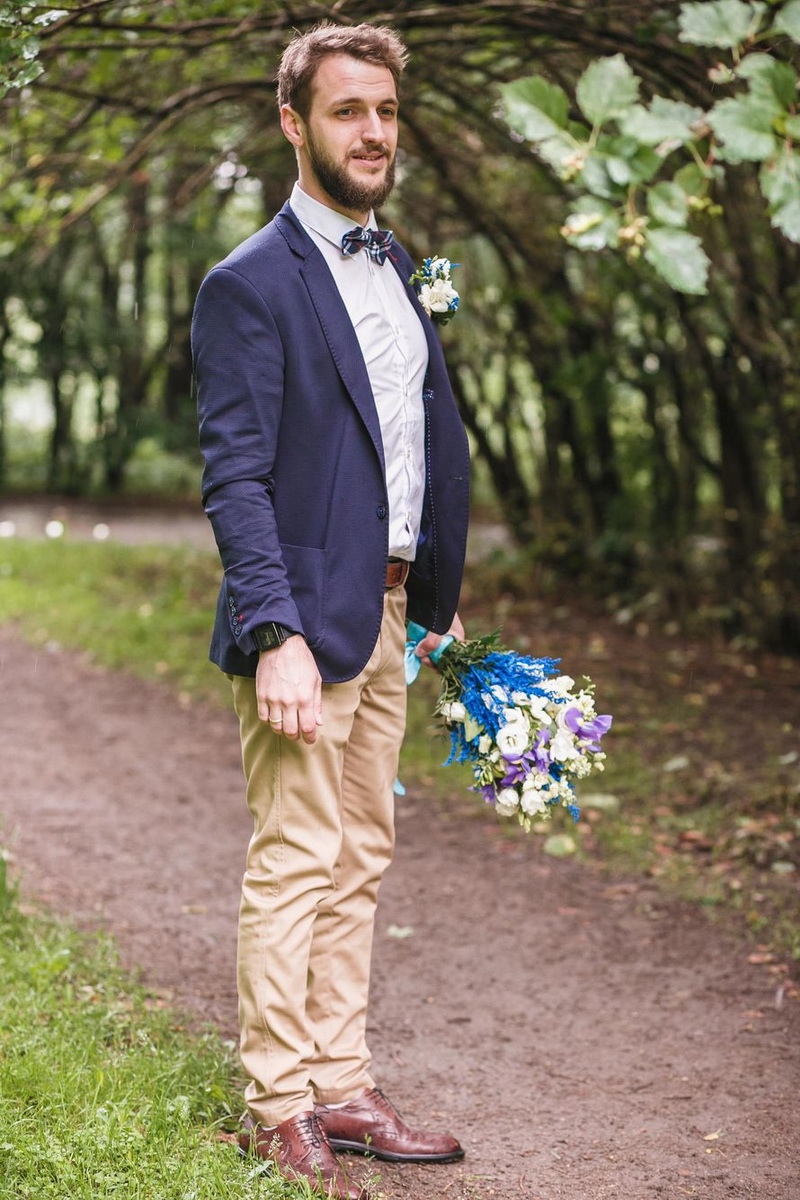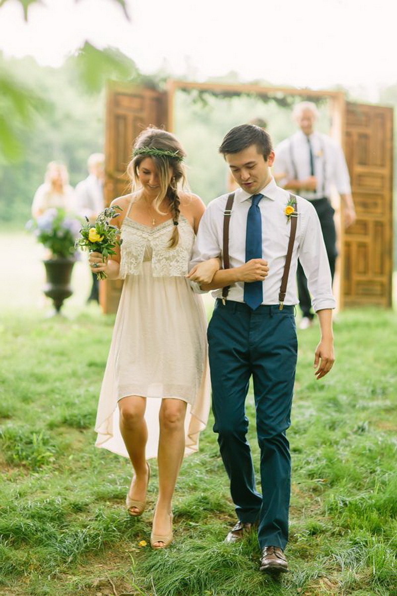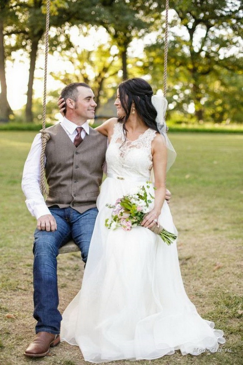 The groom on this day should also be on top. Rustic image suggests any subdued-delicate tones, except for black. You can choose brown linen trousers or cotton options in dark gray. The shirt should be white, with short or long sleeves. The original version will be suspenders in tone to the pants. They ideally emphasize the stylistic direction.