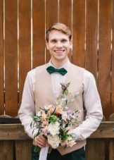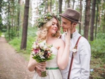 You can complement the image of a cap, vest, but everything must be in harmony in tone. The final touch will be the boutonniere. It is recommended to make them the same colors as the bridal bouquet. Insert simple daisies or a sprig of mountain ash to emphasize the simplicity and attractiveness of the style. It is not necessary for the groom to wear black patent leather shoes with a pointed nose, a top hat, a tail coat. All this is completely inappropriate in this style.