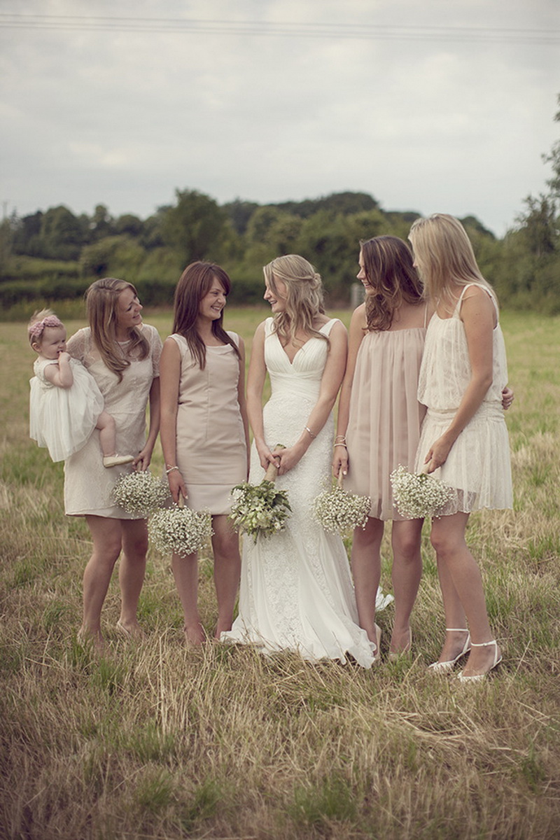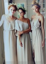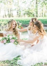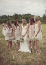 You can apply embroidery, floral motifs in the design. As for shoes, then a good option would be sandals without a heel or a small heel. Hair, you can safely dissolve or give them a little grubby. It will look stylish and fashionable. But the makeup of the bridesmaids should be done naturally, to be in the same style. You can use the tone on the basis of clothing: lavender, pale green, beige. The addition of nacre is also not prohibited.