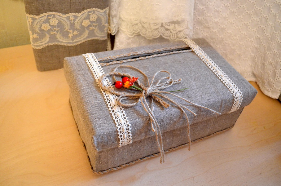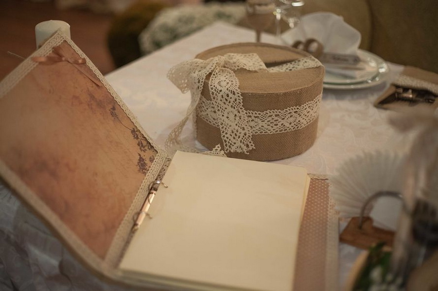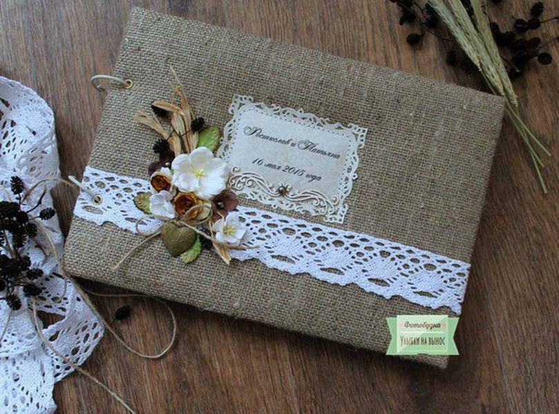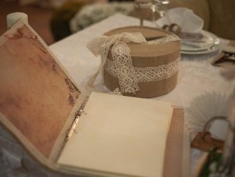 Do not forget about the album for wishes. This book should also have thematic elements. The cover can be left with a classic wooden one or sheathed with burlap like invitations. After all, it is here that guests will leave good wishes or even photos of young people in memory of the holiday. The original version will be the creation of such a book in the form of tree bark. There, guests will be able to make inscriptions for the bride and groom. You can go even further, and make a book in the form of a chest, where guests will put their kind words on wooden hearts. Such a creative approach will cause delight and a storm of positive emotions.