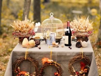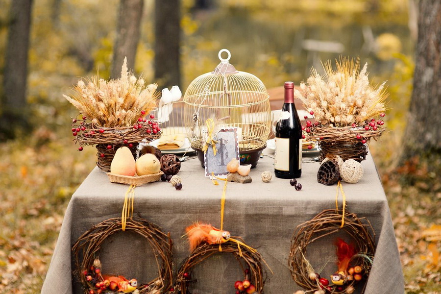 It's no secret that the main dish at a wedding is a cake. By the way, it can be successfully replaced with a loaf or cake. Do not decorate the surface with mastic.However, if you still want to break the rules a bit, then decorate each tier with fresh flowers so that everything is designed in the same style. For the decor, you can use rowan twigs, maple leaves. On the table should be present only natural materials. Tablecloth is better to choose a lace. Napkins and jars can be decorated with burlap, birch bark. The original idea would be to write the numbers of the tables on wooden boards. You can also embroider the figures on linen and put them on the tables.