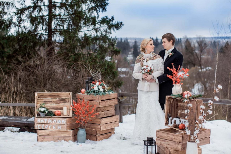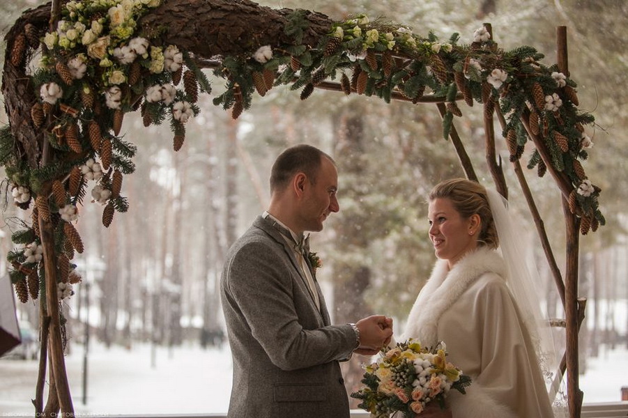 In winter, the formation of a new family is also well marked. Choose any restaurant that will fit the style, as well as bring your own decorative elements to it. Well, if the winter wedding will include a fireplace. It will allow you to capture a cozy atmosphere, to create beautiful photographs. But do not create too elaborate design - this style does not involve numerous draperies, gilding, crystal chandeliers.