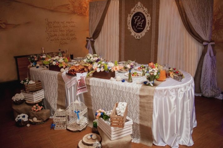 Themed wedding will not do without a table. It is also worth maintaining all the rules of the "rustic" style. For example, guests should definitely be offered guests a compote of plum or apricot, cherry liqueur, house wine, kvass. But what can not be put on the table, so this vodka, brandy, carbonated drinks. Meals can be successfully supplemented with pickles, sauerkraut, cottage cheese or meat pancakes. Must be vegetables and fruits. Pay attention to the cheeses, homemade sausages, baked potatoes with sour cream. Everything should be home-style tasty, so that guests feel comfortable.