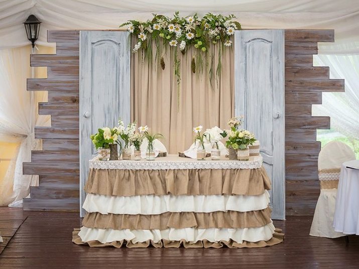 It is important to respect the design of all elements in the style of "rustic." Mandatory decor - fresh flowers. If you want to play a wedding in the winter, then you can apply and options in the pots. Consider the decor options of different elements.