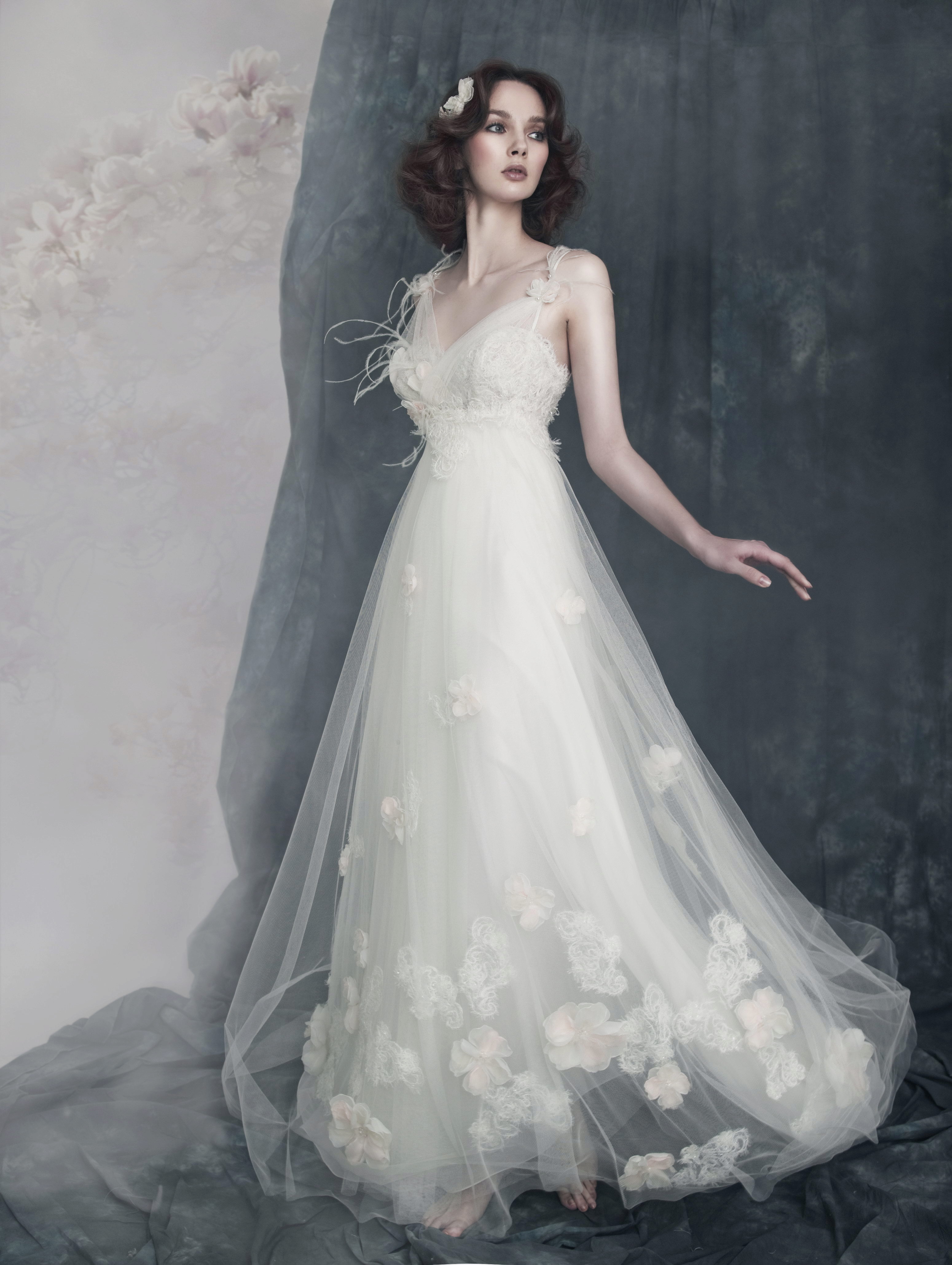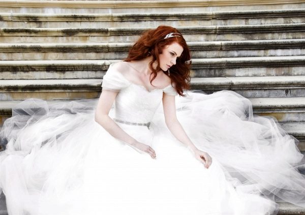 The summer color type includes girls who have an aristocratic appearance — pale skin, light ashen hair, and eyes tucked into a haze. The most suitable dress for such a bride should have a grayish, as if powdered hue, resembling the color of an egg shell. The grayness is inherent in pearl and porcelain shades.