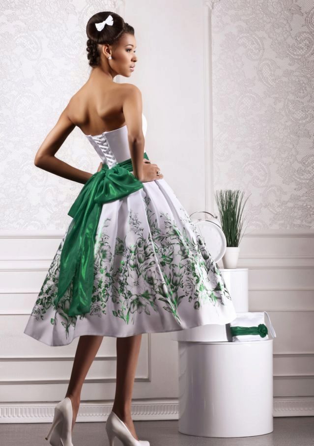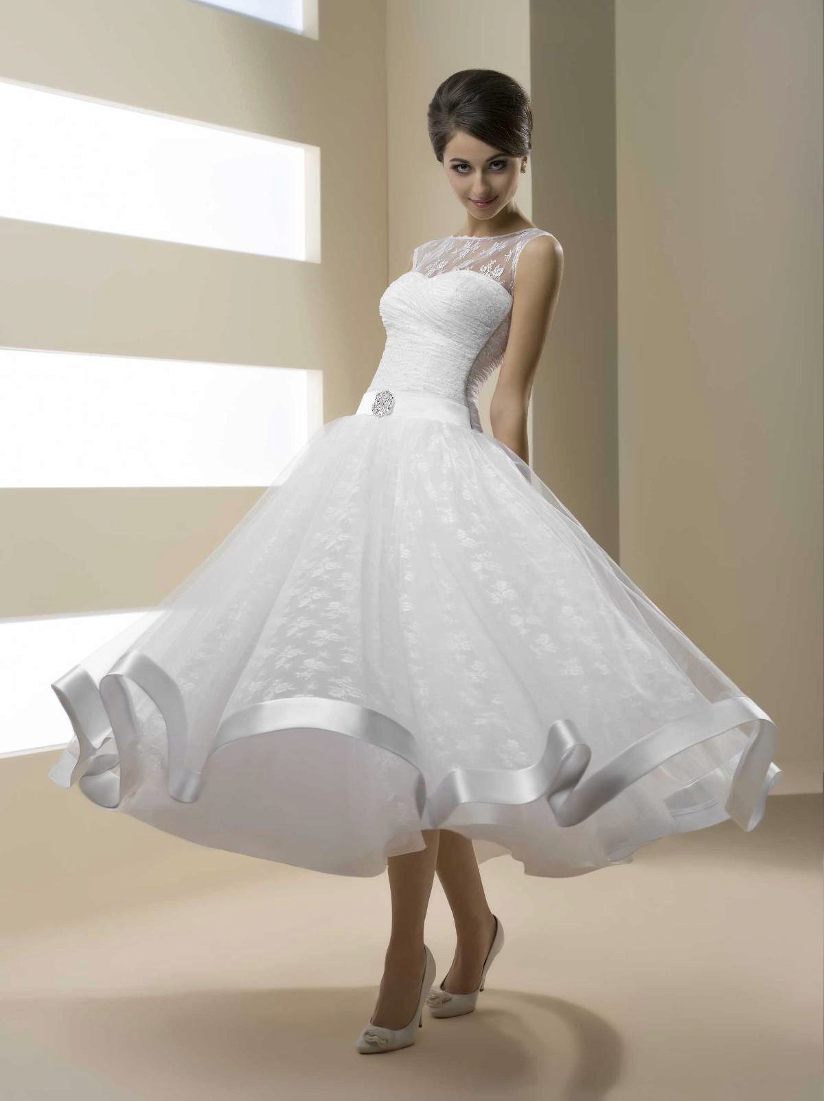 Particularly loved short outfit performed in the style of dresses for cancan. It is very convenient when the train comes unfastened in a short dress, facilitating the celebration of the bride.